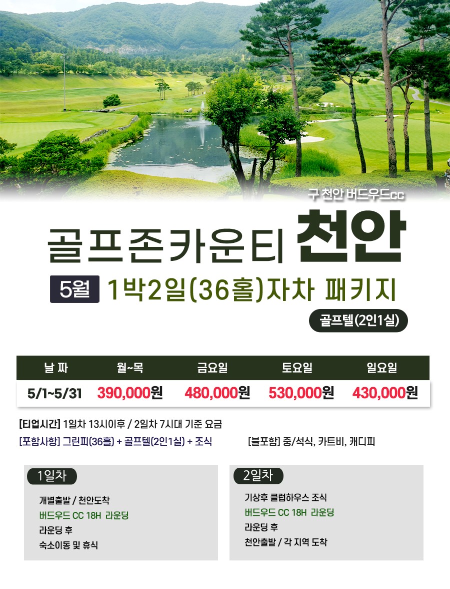 ⚀5月⚀ 천안 명문 골프존 카운티 천안 1박2일 패키지 (36H)