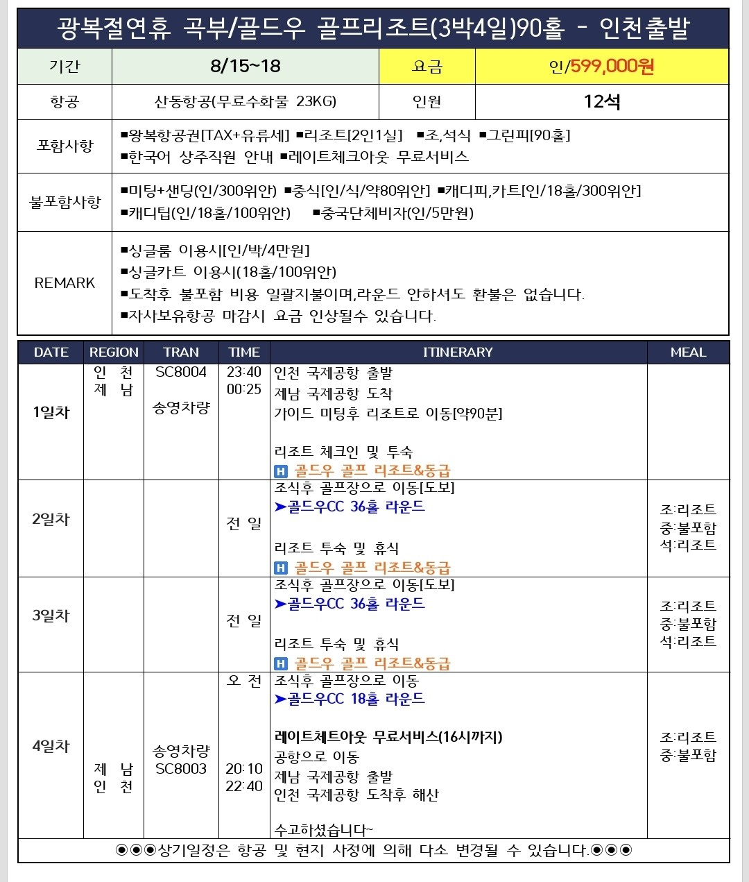 ✔도착후 골프부대비용 일괄 지불이며,개인사정으로 라운드 안하셔도 환불은 없습니다.