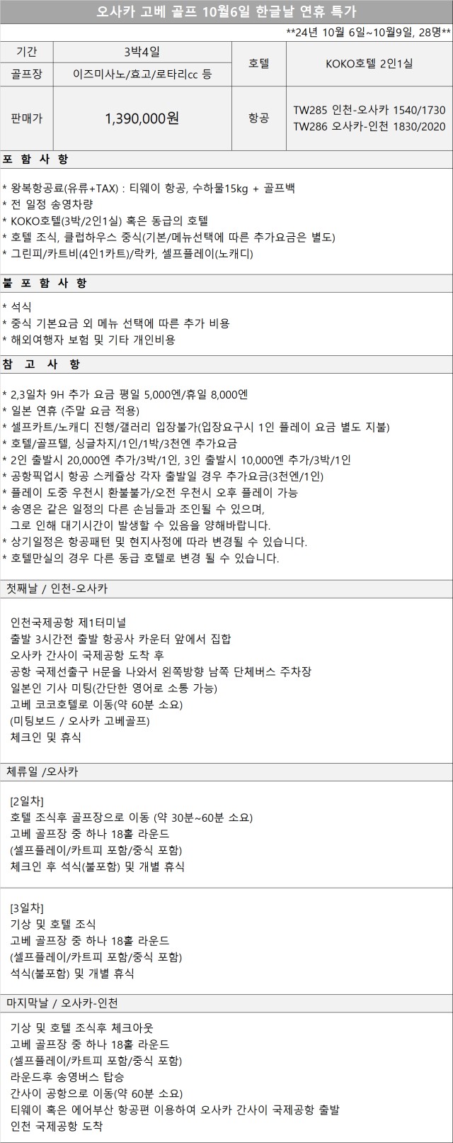 - 출발편 : 10월6일 인천-오사카 TW285 1540/1730