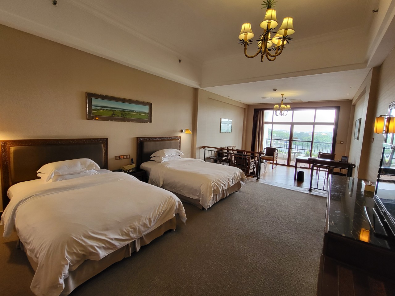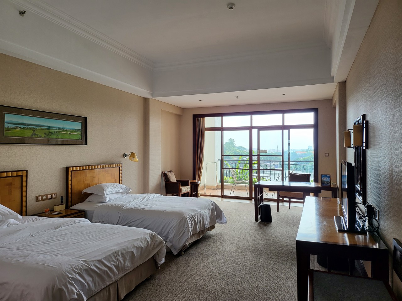 룸은 넓은 편이라 편하게 이용하실 수 있고, 더블 침대 2개와 2인이 사용할 수 있는 테이블도 있고 베란다도 있습니다.