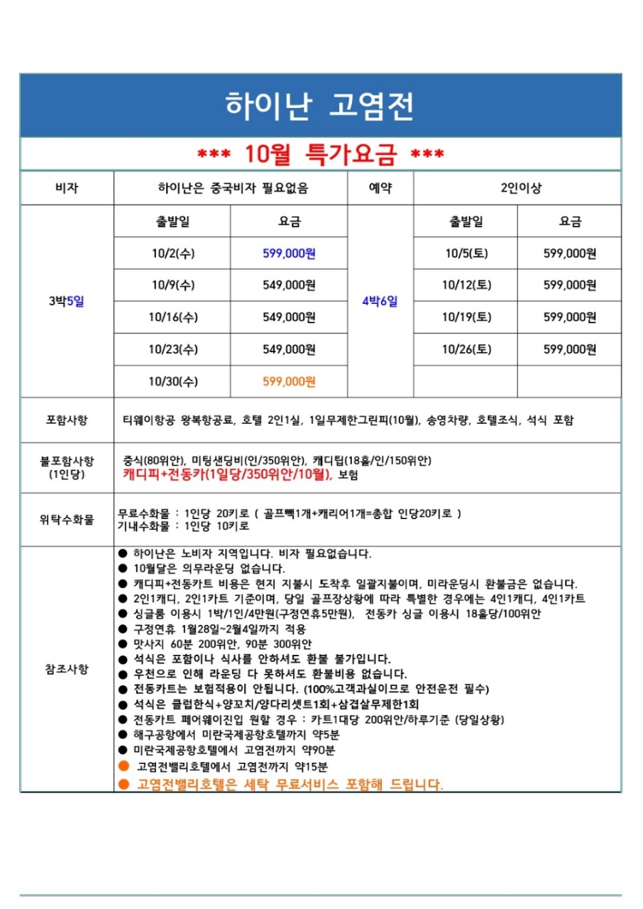 포함 : 왕복항공료, 호텔, 전일정그린피