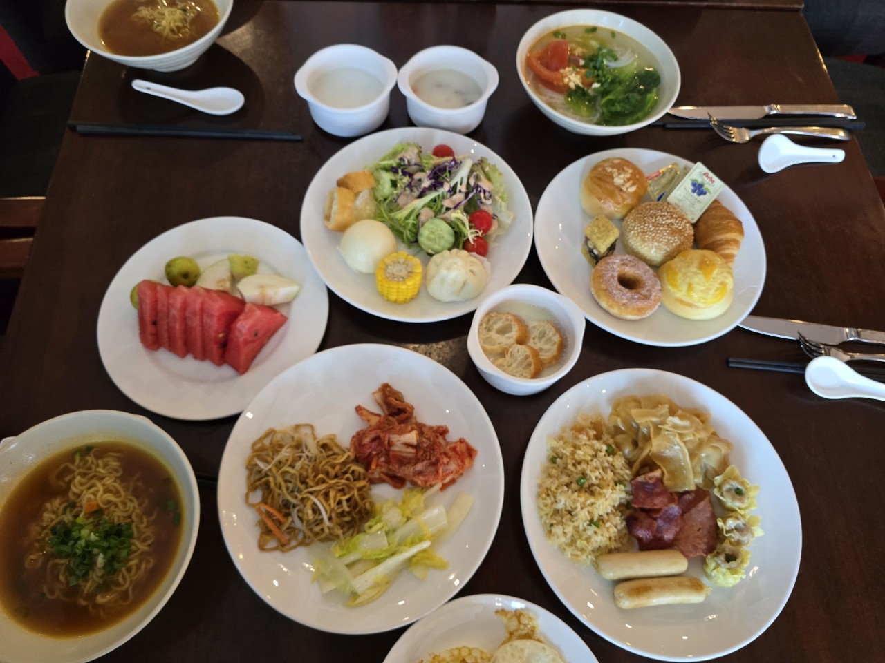 조식은 뷔페식으로 제공이 되며 샐러드, 빵, 현지식및 김치등 다양한 메뉴가 제공이 됩니다.아침에는 신라면도 제공이 되고요~ 김치는 한국보다 더 맛있게 숙성을 잘 시켜 놨네요~